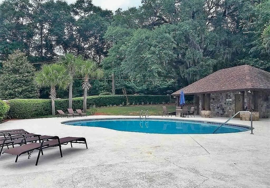 With a swimming pool with patio and bathrooms for lounging and enjoying the beautiful outdoors.
