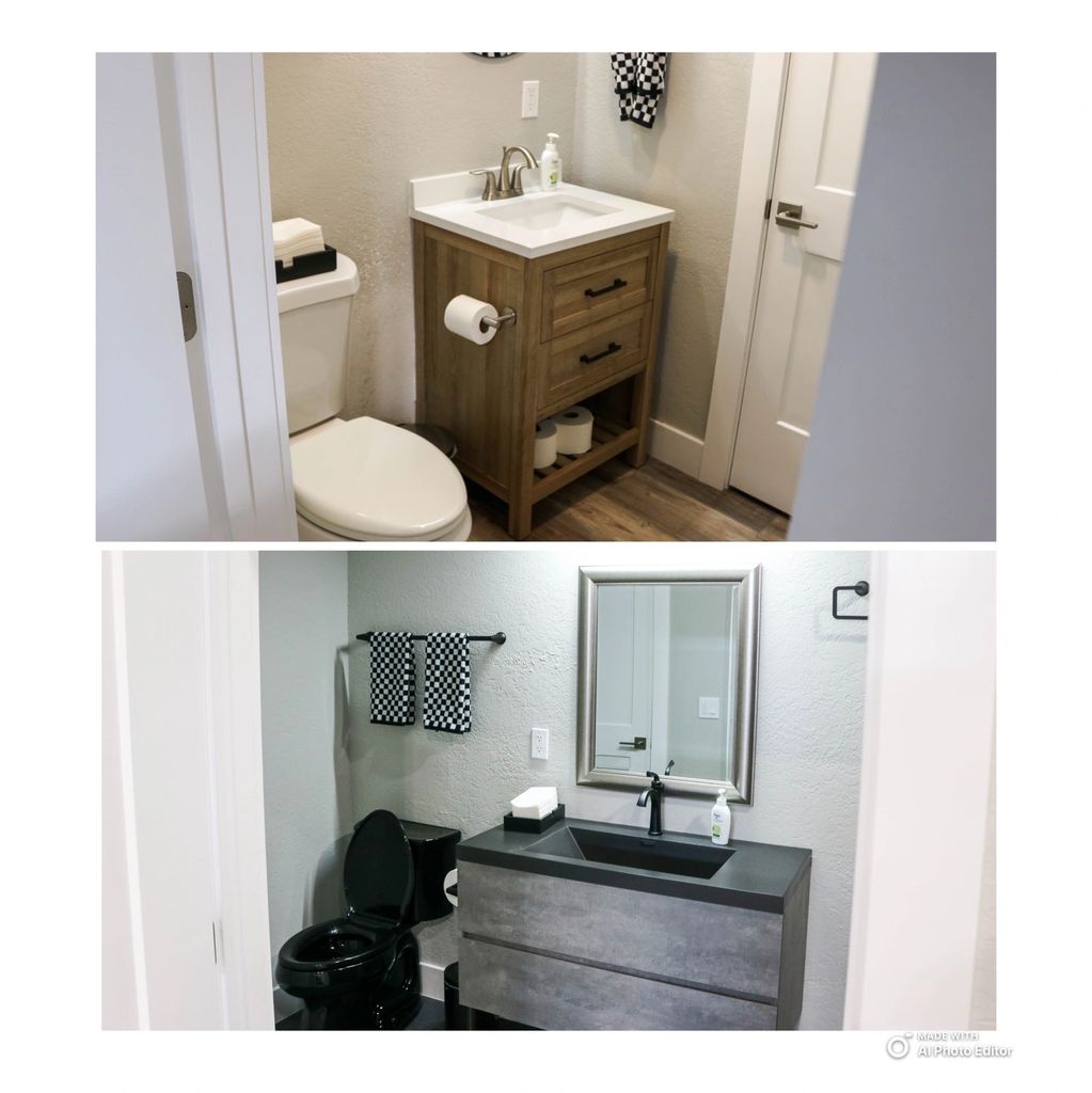 One half bath upstairs and one full bath with shower downstairs in the garage area.